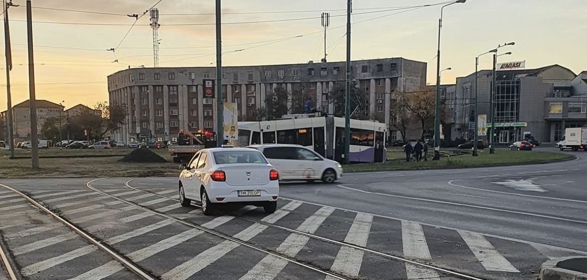 Incident neplăcut pentru călătorii care folosesc mijloacele de transport în comun din zona de sud a Timișoarei. Un tramvai Armonia s-a rupt în două în sensul giratoriu de la AEM.