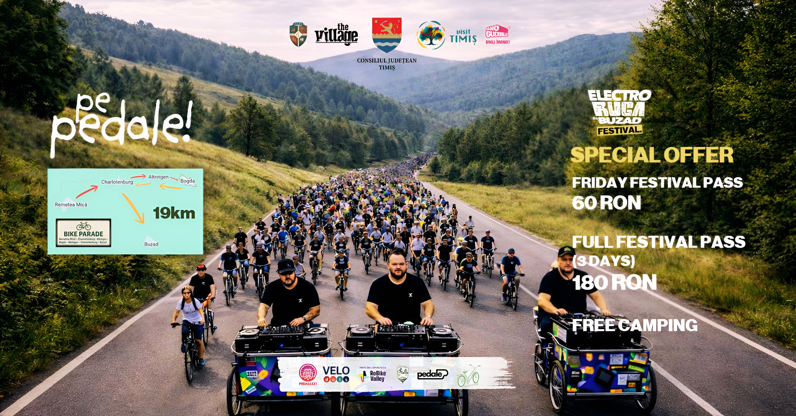 Evenimentul „Pe pedale!” propune un format diferit de deplasare către festivalul Electroruga, prin organizarea unei parade de biciclete care integrează muzica și mișcarea într-un singur traseu. Participanții pornesc din Remetea Mică și ajung în Buzad, parcurgând un traseu de aproximativ 19 kilometri în circa două ore.