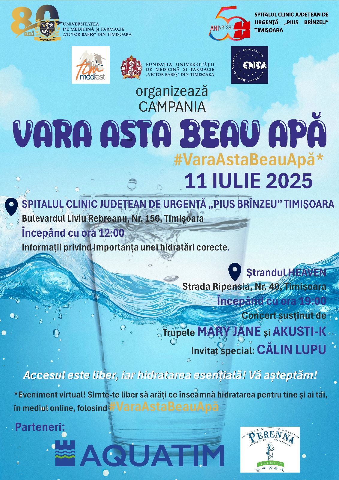 Campania începe online, printr-o serie de informații esențiale despre efectele deshidratării asupra sistemului cardiovascular, urmând să se transforme într-o acțiune concretă pe 11 iulie 2025, ora 12:00, pe platforma din fața Spitalului Județean din Timișoara. Aici, voluntarii vor oferi publicului apă rece și proaspătă, atât de la stațiile Aquatim, cât și sub formă simbolică, în sticle distribuite direct.